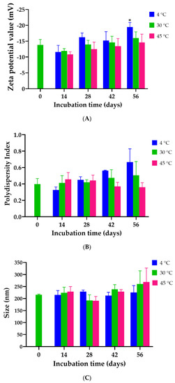 Physical stability of K. galanga rhizome oil microemulsion after storage at 4, 30, and 45 °C for 56 days. (A) Droplet size, (B) polydispersity index, and (C) zeta potential values. The results represent the mean ± SD of three experiments. * indicates p < 0.05 compared with Day 0.