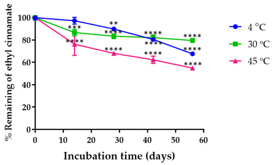 %Remaining of ethyl cinnamate after storage at 4, 30, and 45 °C for 0, 14, 28, 42, and 56 days. **, ***, and **** indicate p < 0.01, p < 0.001, and p < 0.0001.