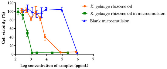 Cell viability of RAW 264.7 after the treatment with K. galanga rhizome oil, K. galanga rhizome oil microemulsion, and blank microemulsion for 24 h.