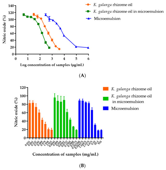 (A) Nitric oxide secretion (%) of RAW 264.7 after the treatment with K. galanga rhizome oil, K. galanga rhizome oil microemulsion, and blank microemulsion for 18 h, compared with LPS-induced RAW 264.7 cells, (B) plots of nitric oxide secretion (%) of RAW 264.7 vs. concentrations of treated samples, and (C) cell viability of RAW 264.7 after the treatment with K. galanga rhizome oil, K. galanga rhizome oil microemulsion, and blank microemulsion after nitric oxide induction with LPS.