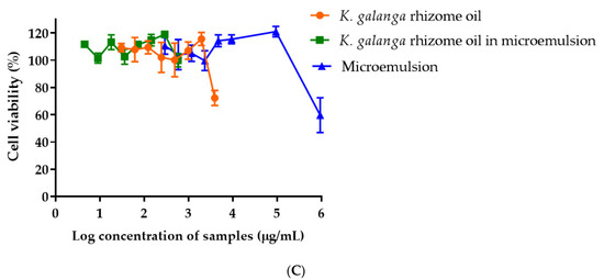 The effect of K. galanga rhizome oil and microemulsion on the cytotoxicity of RAW 264.7, a macrophage cell line, was measured via MTT assay [59]. Briefly, RAW 264.7 cells were plated at a density of 1 × 104 cells/well and incubated for 24 h. After incubation, RAW 264.7 cells were treated with 100 µL of K. galanga rhizome oil at concentrations of 0.25–783 mg/mL and microemulsion containing K. galanga rhizome oil at concentrations of 0.07–231 mg/mL. The blank microemulsion was tested at concentrations of 0.29–935 mg/mL for 24 h. The samples were removed and replaced with 100 µL of 0.5 mg/mL MTT solution and incubated for 3 h at 37 °C, 5% CO2. The formazan crystals were solubilized in 100 µL DMSO. The absorbance was determined at 550 nm using a multi-mode microplate reader (Spectra Max M3, Molecular Devices, San Jose, CA, USA) equipped with SoftMax® Pro 7 software (Molecular Devices, San Jose, CA, USA). Cell viability was calculated using the following equation.