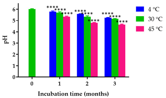 Effects of long-term storage on the pH of K. galanga rhizome oil microemulsion-based hydrogel after storage at 4, 30, and 45 °C for 3 months. **** indicates p < 0.001.