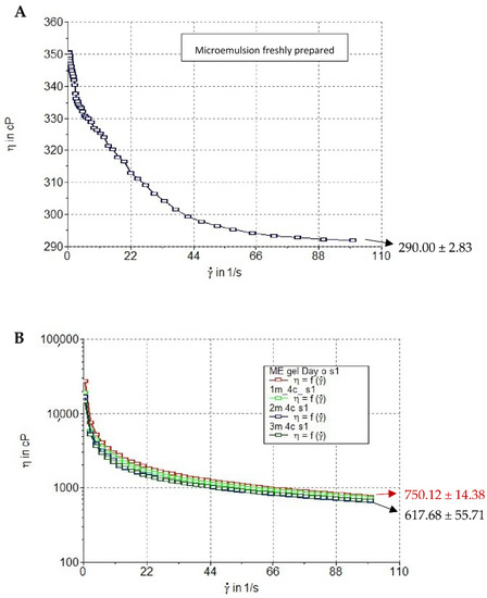 The appearance and homogeneity of the hydrogel formulations containing K. galanga rhizome oil microemulsion were visually observed. The best formulation was inspected to characterize for the pH, viscosity, rheology, and physical stability. The pH of the hydrogels was determined using a pH meter (Orion model 320, Thermo Electron Corporation, Waltham, MA, USA). The viscosity and rheology of hydrogels were measured using a Thermo Scientific HAAKE RheoStress 1 rheometer with a plate and plate geometry (Waltham, MA, USA) (1.0 mm gap, 60 mm diameter). The hydrogel’s temperature was set to 25 °C. The shear rate ranged from 0.5 to 100 s1 with a frequency of 1 Hz.