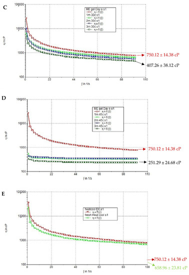 The viscosity and rheology of K. galanga rhizome oil microemulsion and hydrogel was measured using a rheometer. The rheology diagram of the microemulsion and the hydrogel in Figure 9A–D indicates that the K. galanga rhizome oil microemulsion and hydrogel had pseudoplastic flow properties. The viscosity of the K. galanga rhizome oil microemulsion at a shear rate of 0.5, 20, 40, 60, 80, and 100 s−1 were 346.00 ± 1.41, 314.50 ± 2.12, 296.50 ± 3.54, 292.50 ± 3.54, 290.5 ± 2.12, and 290.00 ± 2.83. The viscosity values of the hydrogel measured at 25 °C after fresh preparation at a shear rate of 0.5, 20, 40, 60, 80, and 100 s−1 were 23,678.84 ± 5114.17, 2172.03 ± 129.29, 1358.28 ± 42.05, 1053.95 ± 26.28, 869.19 ± 15.28, and 750.12 ± 14.38 cP, respectively. The viscosity of the hydrogel depended on the storage time and temperature. The apparent viscosity of SCMC hydrogel is a function of temperature and shear rate. The SCMC polymer is formed via electrostatic interactions of hydrogen bonding. High temperature can break these bonds to an equilibrium state. The equilibrium corresponds to an activation energy value, determining the temperature dependence of the viscosity [54]. The viscosity of hydrogels stored at 4, 30, and 45 °C for 90 days was significantly reduced after applying a shear rate of 100 s−1 (Figure 9D). The viscosity of microemulsion-based hydrogel after six heating/cooling cycles was reduced to 658.96 ± 23.81 cP at a shear rate of 100 s−1. These results suggest that K. galanga rhizome oil microemulsion-based hydrogel should be stored at 4 °C.