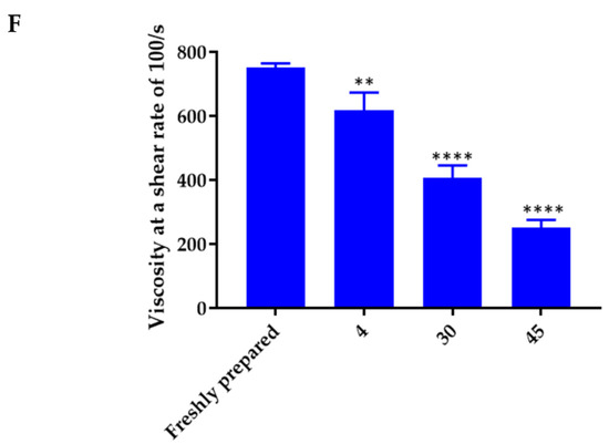 Rheology behavior of (A) K. galanga rhizome oil microemulsion and K. galanga rhizome oil microemulsion-based hydrogel after storage at (B) 4 °C, (C) 30 °C, (D) 45 °C, and (E) 6 heating/cooling cycles and (F) viscosity of hydrogel at shear rate of 100/s after 3-month storage. ** and **** indicate p < 0.01 and p < 0.0001.