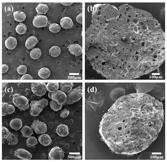 The surface and cross-section morphology of HPC/CS@5-Fu and GO/HPC/CS@5-Fu aerogels were investigated using SEM techniques and are illustrated in Figure 1. As shown Figure 1a, the HPC/CS@5-Fu clearly depicts a uniform spherical shape and has diameters in the range of 0.3 to 0.6 mm. In addition, the surface appears smooth and regular, which is consistent with previous work [12,17]. With the incorporation of GO (Figure 1c), the surface became rough and irregular, which can be ascribed to the GO sheet’s wrinkled structure, leading to a loss of the spherical shape. The cross section of the HPC/CS@5-Fu aerogel exhibits a porous structure, while the cross section of GO/HPC/CS@5-Fu is denser with very few visible cavities. This is due to the enhanced cross-linking density of glutaraldehyde with the hydroxyl group originating from GO [25,26], and the difference in the porous structure of HPC/CS@5-Fu and GO/HPC/CS@5-Fu will have an influence on the release of 5-Fu.