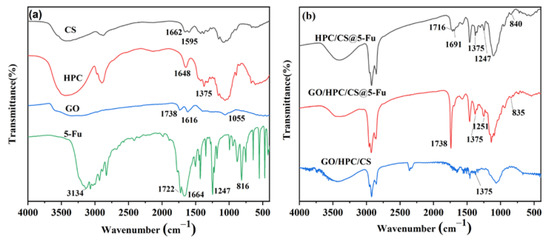 The FTIR spectra of raw material such as CS, HPC, GO, 5-Fu, and the obtained aerogels were obtained to assign the functional groups and the interaction between them (Figure 2). As show in Figure 2a, a broad peak from 3300 to 3500 cm−1 of -OH and -NH2 groups was observed for CS; C=O stretching of amide I at 1662 cm−1 and N-H bending of amide II at 1595 cm−1 were also observed [25]. For the spectrum of HPC, the C-H stretching for -CH2- and C-O stretching were observed at 2895 and 1064 cm−1, respectively [23]. For the spectrum of GO, the bands at 3400 cm−1, 1738 cm−1, and 1055 cm−1 were clearly observed for the O-H stretching, C=O stretching, and C-O stretching, respectively [29]. The FTIR spectrum of 5-Fu clearly marked the presence of 5-Fu as evident from the observed bands at 3134 cm−1 for C=C stretching of aromatic group, 1664 cm−1 for C=O stretching, 1247 cm−1 for C-F stretching, and 816 cm−1 for C-H bending in -CF=CH- [28,30]. As shown in Figure 2b, all the vibration peaks for the corresponding raw materials were observed in the HPC/CS@5-Fu and GO/HPC/CS@5-Fu aerogels, which revealed the successful loading of 5-Fu. In addition, a new peak for imines (C=N) at 1691 cm−1 was observed, which demonstrated the cross-linking of CS, HPC, and GO with glutaraldehyde [26,31,32].