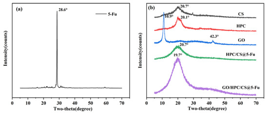 The XRD patterns of the raw materials and aerogels are shown in Figure 3. The XRD pattern of pure 5-Fu is shown in Figure 3a, which contains a sharp peak at 28.6°, suggesting the crystalline nature of 5-Fu. This peak disappeared in 5-Fu-loaded aerogel, which indicated the uniform molecular dispersion of 5-Fu in the polymer matrix [15,30]. CS and HPC show a broad peak at 20.7° and 20.1° (Figure 3b), respectively, corresponding to its backbone, which is consistent with previous work [15,23]. The XRD pattern of GO contains two characteristic peaks at 10.9° and 42.3° corresponding to the (001) and (100) planes, demonstrating the full exfoliation of graphite oxide into GO [19,25]. For the XRD patterns of the two drug-loaded aerogels, only the characteristics of CS and HPC at 20.7° and 19.7° were observed, respectively, which reveal the formation of the desired aerogels [15,23,26].
