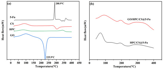 The DSC curves of the raw materials and aerogels are shown in Figure 4. 5-Fu shows a sharp endothermic peak at 288.9 °C, which can be ascribed to the melting point of 5-Fu. This characteristic peak was not observed in the drug-loaded aerogel, demonstrating that the 5-Fu was molecularly well dispersed again [16,17]. The CS and HPC show a Tg around 118 and 102 °C, respectively, corresponding to the movement of the chain segment [12,16], and a sharp exothermic peak at 303 °C was observed for the decomposition of CS [15]. The DSC curves of GO suggested that the decomposed started from 180 °C, and the oxygen-containing groups were completely destroyed at 225.9 °C [19]. In the case of 5-Fu-loaded aerogels, a strong peak was observed at 70 and 90 °C for HPC/CS@5-Fu and GO/HPC/CS@5-Fu, respectively. In addition, a small peak at 190 °C and a broad peak at 300 °C were observed due to endothermic transitions, which is consistent with previous work [12,15].