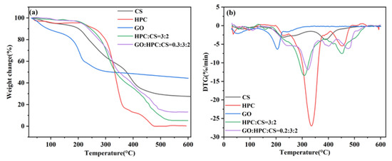 The TG and DTG curves of the raw materials and aerogels are shown in Figure 5. Compared with the HPC/CS@5-Fu and GO/HPC/CS@5-Fu aerogels, all of the raw materials show weight loss before 150 °C, which can be ascribed to the loss of combined water (bound to hydrophilic groups via hydrogen bonding) [9]. The CS shows two degradation stages, the temperatures of maximum weight loss rate (Tmr) are 235 and 387 °C, with a high residue of 27.6% at 600 °C [15]. The HPC shows multiple degradation stages, the Tmr is 336 °C, and it was almost completely decomposed at 600 °C [9]. The GO shows fast weight loss at 203 °C, corresponding to the loss of oxygen-containing groups, with the highest residue of 44.4% at 600 °C [20]. For the two aerogels, similar degradation behaviors were observed, and the Tmr increased from 310 to 320 °C with the incorporation of GO [20,29,33]. The maximum weight loss rate for the two aerogels was comparatively slower than that of pure HPC, indicating that the obtained aerogels possess better thermal stability [9].