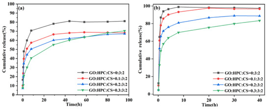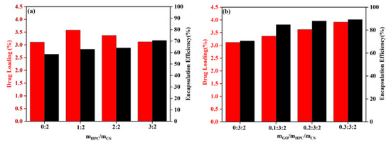 The effects of HPC and GO content on the DL and EE for HPC/CS@5-Fu and GO/HPC/CS@5-Fu are shown in Figure 6. As shown in Figure 6a, with the increase of HPC content, the DL firstly increased and then decreased; the highest DL was 3.58%. The EE increased with the increase of HPC content; the highest EE (70.56%) was obtained for mHPC/mCS = 3:2, which can be ascribed to more hydrogen bonds being formed [8]. As shown in Figure 6b, with the increase of GO content, both the DL and EE increased obviously, which will reduce the number of doses. The highest DL and EE were 3.91% and 89.24%, which can be ascribed to the increase of hydrogen bonds and π–π stacking between 5-Fu and GO [25,26].