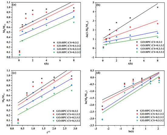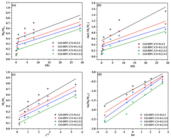The release kinetics can reveal the release mechanism and determine the potential application of the obtained aerogel carrier. To give a deep insight into the release process, four kinetic models were used to evaluate the release behavior for different GO/HPC/CS@5-Fu aerogels, including zero-order, first-order, Higuchi, and Korsmeyer–Peppas models (Equations (1)–(4)) [9,14,15,26].