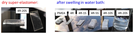 - Byś, K.; Strachota, B.; Strachota, A.; Pavlova, E.; Steinhart, M.; Mossety-Leszczak, B.; Zając, W. Novel Tough and Transparent Ultra-Extensible Nanocomposite Elastomers Based on Poly(2-methoxyethylacrylate) and Their Switching between Plasto-Elasticity and Viscoelasticity. Polymers 2021, 13, 4254. [Google Scholar] [CrossRef] [PubMed]