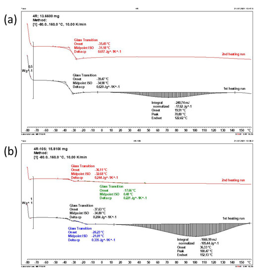 | Sample | Tg (1) [°C] | Change in Heat Capacity at Tg (1) [J g−1 K−1] | Tg (2) [°C] | Change in Heat Capacity at Tg (2) [J g−1 K−1] |