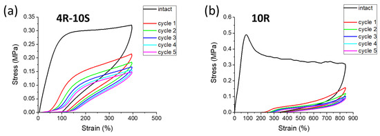 2.6. Elasticity vs. Creep after Large Stretching Deformation: Cyclic Loading Tests