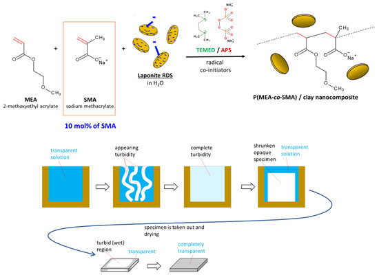 - Strachota, B.; Hodan, J.; Matějka, L. Poly(N-isopropylacrylamide)-clay hydrogels: Control of mechanical properties and structure by the initiating conditions of polymerization. Eur. Polym. J. 2016, 77, 1–15. [Google Scholar] [CrossRef]