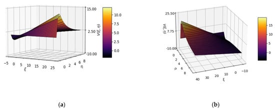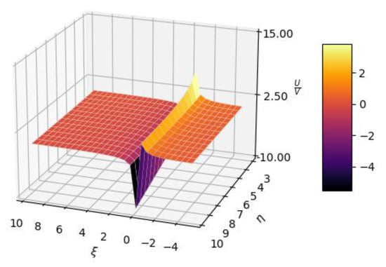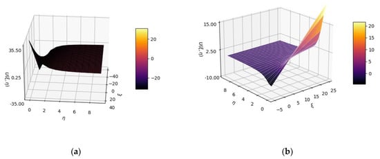 In Figure 3, 3D plot representations of the U/V multifractal function, with expressions dependent of the ξ and η variables, are presented.