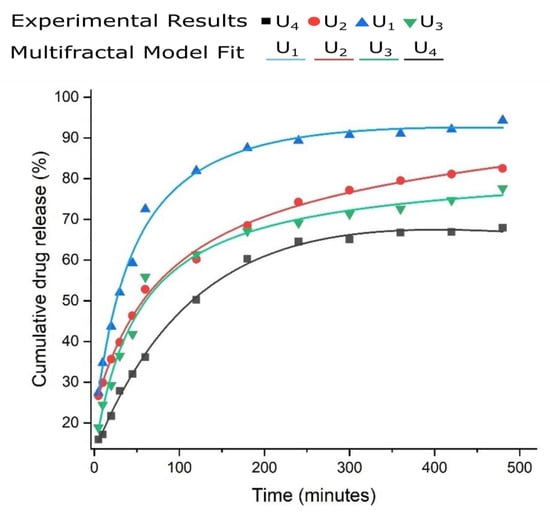5-fluorouracil release of experimental presentation [17]; the formulations are accommodated in multifractal theoretical replica (solid-colored lines).