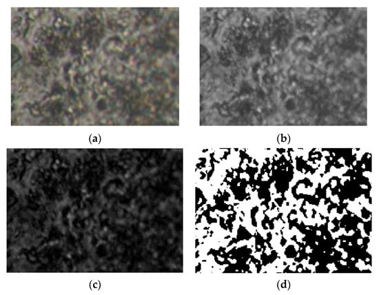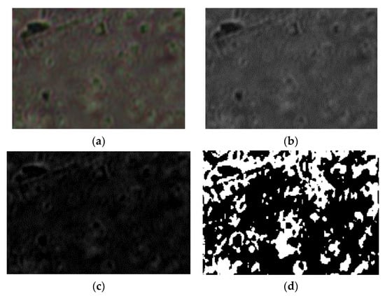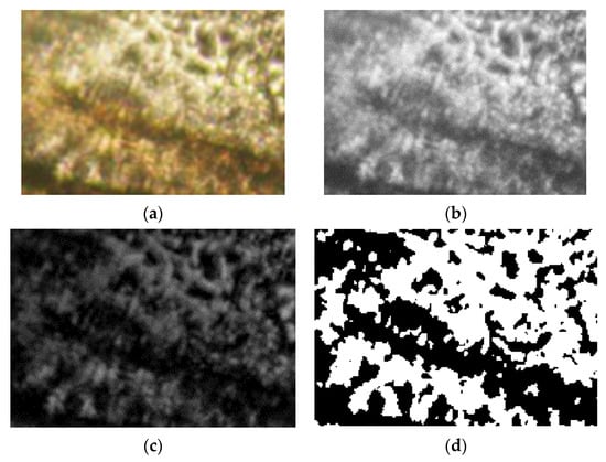 Primary processing of the selected image U4. (a)—original image (the entire portion); (b)—the grayscale version; (c)—the gray scale version without luminance; (d)—binarized version. A threshold of 35 was used for binarization.