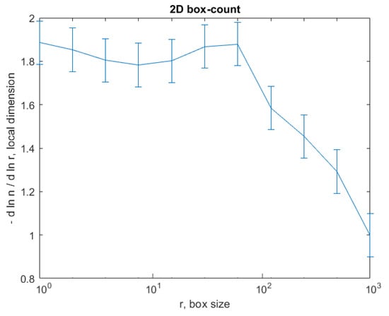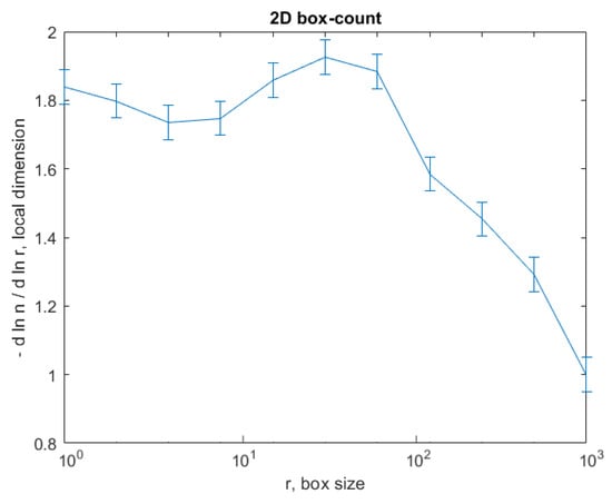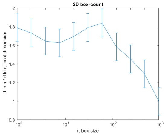 The graph in Figure 8 shows the results of the 2D box-count algorithm and the local fractal dimension of the investigated image U1 [25,27].