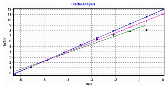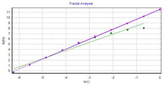 Figure 9 shows the verification of the selected U1 image area with the software Harmonic and Fractal Image Analyser Demo version 5.5.30 [28] of the fractal dimension for various ruler scales r.