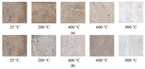 When the temperature reached approximately 200 °C, a small amount of visible steam began to emerge from the electric furnace door during the heating process, and an unpleasant odor, similar to that of burned plastic, was emitted. After the temperature was maintained at 200 °C, a small amount of water droplets seeped from the furnace mouth along the joint for some time. As the temperature reached 300–400 °C, the amount of steam increased significantly. Then, when the temperature was approximately 400 °C, a large amount of thick smoke, accompanied by a pungent smell, was emitted. This process lasted approximately 15 min and then the rate of thick smoke emission gradually decreased. However, a large number of water droplets accumulated on the upper edge of the furnace mouth. When the temperature was heated above 550 °C, the amount of steam gradually decreased; this lasted for a long time until the steam dissipated. In addition, when the temperature was increased to 400, 600, and 800 °C, a bursting sound from the electric furnace was heard. Some cementitious composite samples without PVA fibers experienced explosive spalling. In contrast, no explosive spalling occurred on the PVA-FRCC specimens during the entire duration of high-temperature exposure, indicating that PVA fibers help to resist explosive spalling.