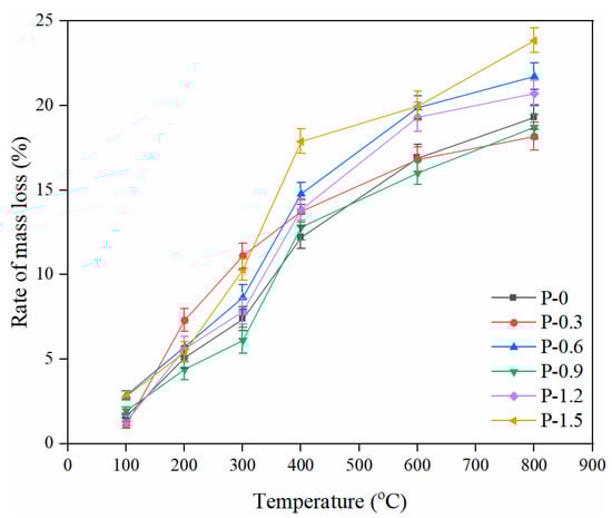 The deterioration of the samples at high temperature was also assessed by the mass loss. Figure 3 depicts the relationship between the mass loss rate of PVA-FRCC samples and temperature. The mass loss rate of samples increases with the heating temperature. The mass loss is mainly related to the loss of various types of water in the matrix after high-temperature exposure. When the temperature is below 200 °C, the mass loss is mostly due to the loss of a small amount of free water. The mass loss rate is small and lower than 5%, and the growth rate is relatively gradual. When the temperature increases from 200 °C to 400 °C, large amounts of free water and chemical crystal water evaporate or decompose [36]. At this stage, the mass loss rate of specimens increases significantly, and the rate of change accelerates. The maximum mass loss of some of the specimens reaches 17.88% at 400 °C. When the temperature is between 400 °C and 600 °C, the mass loss is mostly caused by decomposition of Ca(OH)2 and bond loss of C–S–H gels [37]. In addition, the rate of increase in mass loss decreases significantly. The water inside the matrix evaporates, and carbonate begins to decompose when the heating temperature exceeds 600 °C.