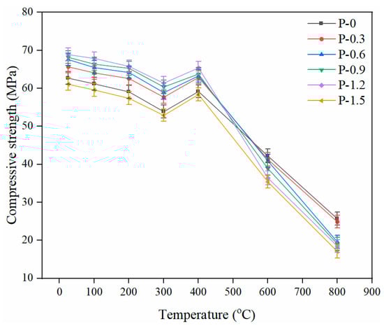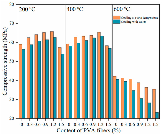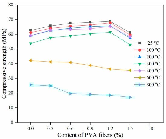 Figure 5 presents the effect of PVA fiber content on the compressive strength of PVA-FRCC specimens after high-temperature exposure. The compressive performance of cementitious composites with fibers is better than that without fibers in the temperature range of 25–400 °C. With an increasing content of PVA fibers, the compressive strength at different temperatures increases first and then reduces. The compressive strength of the sample reaches the maximum when the PVA fiber content is 1.2%. At this condition, the compressive strengths are 68.9, 67.9, 65.8, and 61.4 MPa after exposure to 100, 200, 300, and 400 °C, respectively. These correspond to an increase of 9.9%, 10.9%, 11.3%, and 13.9%, respectively, as compared to the strength at room temperature. The compressive strength of PVA-FRCC samples after exposure to 600 °C and 800 °C reduces gradually with the PVA fiber content. In contrast to the reference group, the strength of the specimen with 1.5% fiber content decreases by 16.1% and 33.5%, respectively. An appropriate amount of PVA fibers can not only inhibit the generation and development of cracks, but also satisfactorily restrain the thermal deformation of the cement matrix before fiber melting, resulting in the reduction of damage in the matrix and improvement in strength [41]. However, when the content exceeds 1.5%, fiber agglomeration can generate more pores and defects, causing a decrease in strength. When the specimens are subjected to a high temperature of 400 °C, the fibers are completely melted. The higher the fiber content, the greater the number of pores and channels formed after fiber melting and the lower the strength.