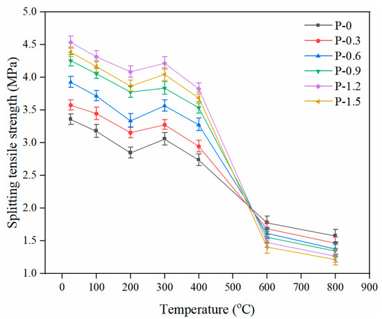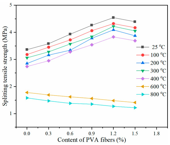 Figure 8 illustrates the impact of the PVA fiber content on the splitting tensile strength of specimens subjected to high temperature. At temperatures below 400 °C, PVA fibers can enhance the splitting tensile property of the specimen. The variation of the splitting tensile strength with the PVA fiber content is similar to that of the compressive strength. At a 1.2% fiber content, the splitting tensile strength reaches the maximum. At 25, 200, 300, and 400 °C, the splitting tensile strengths of the specimens with 1.2% PVA fiber content are 35.1%, 43.5%, 37.9%, and 39.8% higher than that of the specimen without PVA fibers, respectively. When the temperature is elevated to 600 °C and 800 °C, the splitting tensile strength decreases with the increasing PVA fiber content because the fibers have completely melted and lost their bonds to the matrix.