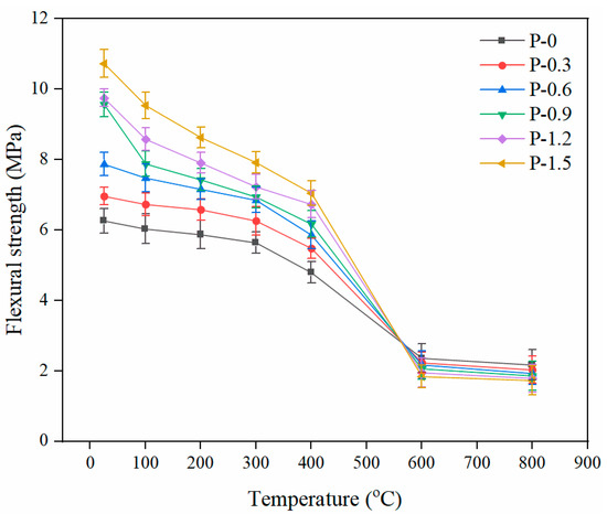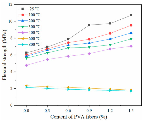 Figure 10 illustrates the effect of PVA fiber contents on the flexural strength of the PVA-FRCC samples exposed to high temperature. When the temperature is below 400 °C, the flexural strength of the specimens increases with the increasing PVA fiber content. At a 1.5% PVA fiber content, the flexural strengths of the specimens at 25, 100, 200, 300, and 400 °C are 10.73, 9.54, 8.63, 7.92, and 7.05 MPa, respectively. These correspond to an increase of 71.4%, 58.2%, 47.0%, 40.4%, and 47.2%, respectively, compared to that of the specimen without fibers. The most significant increase in the flexural strength is at room temperature, and the higher the temperature, the lower the increase. This indicates that, when the PVA fibers are not completely melted, the influence of high temperature on them remains on the fiber surface. The fibers can provide a bridging effect at lower temperatures, thus improving the flexural strength. However, when the temperature reaches 600 and 800 °C, the completely melted fibers lose their bonds with the matrix, weakening the promotion impact of fibers on flexural strength. The larger fiber content corresponds to more defects and cracks that occur after high-temperature exposure, leading to a lower flexural strength [25].