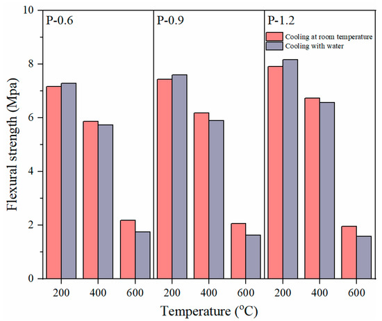 The above results are from the flexural strength analysis of PVA-FRCC samples cooled under natural conditions after high-temperature exposure. Figure 11 depicts the variation trend of the flexural strength of the PVA-FRCC specimens with temperature under different cooling methods. The relationship between the flexural strength and temperature after cooling with water is the same as that after cooling at room temperature. At a 200 °C heating temperature, the flexural strengths of the PVA-FRCC samples cooled with water are 7.28, 7.59, and 8.16 MPa, which are 1.7%, 2.1%, and 3.2% higher than those of the specimens cooled at room temperature, respectively. However, as the temperature increases to 400 and 600 °C, the flexural strengths of the specimens cooled with water are lower than those of the specimens cooled at room temperature. Cooling with water causes more severe damage to the matrix exposed to 600 °C. A possible reason for this is that water can enter the specimen during water cooling for a period of time when the temperature is low, providing a humid environment for the secondary hydration reaction. This can compensate for the loss of internal structural damage caused by temperature stress and can improve the flexural strength. However, as the temperature exceeds 400 °C, the damage to the structure caused by the temperature is significant. The improvement caused by the secondary hydration reaction is considerably less than the damage caused by the high temperature. Therefore, the water-cooled specimens exhibited a lower flexural strength [43].