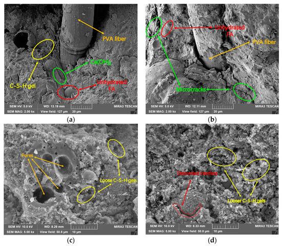 To study the microstructure of the fibers and matrix at different temperatures, the specimens exposed to 200–800 °C were observed by the SEM. Figure 12 displays the micrographs of specimens with and without high-temperature exposure. The specimens at room temperature (Figure 12a) mainly consist of poorly crystallized and fibrous particles of C–S–H gels, amorphous and well-crystallized Ca(OH)2, and a large number of unhydrated FA particles. The dense structure in Figure 12a resulted in excellent mechanical properties of the specimens [2,44]. Compared to the microstructures of the unheated specimens, the specimens exposed to 200 °C did not change significantly. However, a few microcracks can be observed in Figure 12b, which mainly caused strength decline. Pores are clearly seen in Figure 12c. This is because, at 400 °C, the PVA fibers completely melted to form pores and channels. The existence of these pores and channels is conducive to the release of pore pressure, which significantly reduces the explosive spalling of the specimens. However, these pores and channels also significantly reduced the mechanical properties of the specimens. In addition, the loose microstructure can also be clearly observed. The microstructures of the specimens become looser after being exposed to 600 °C (Figure 12d) and 800 °C. All hydration products nearly lost their crystal structure characteristics. In general, C–S–H crystals can form disordered spaces in the matrix at high temperatures, leading to a reduction in microstructure densification [45]. Sahmaran [28] found that, when the temperature exceeds 800 °C, cracks around unhydrated FA particles increase, and quartz sands lose their characteristic structure.