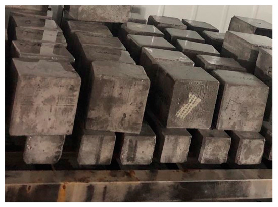 After casting, the surfaces of the specimens were covered with a layer of plastic film. After 24 h, the specimens were removed from the molds [48]. The specimens were placed in a curing room (temperature 20 ± 2 °C, relative humidity ≥ 95%) for 28 days (Figure 14) and then taken out. To reduce the moisture content of the specimens to that in a normal state, they were placed in a dry and ventilated environment for 30 d. The specimens were then heated to the target temperature in a high-temperature electric furnace. The target temperature was then maintained for 120 min. Subsequently, the test specimens were removed and cooled until a constant temperature was reached. Two cooling regimens were adopted, namely, cooling at room temperature and water cooling. Relevant mechanical property tests were carried out after storing the specimens indoors for 3 d. The target temperatures were set as 25, 100, 200, 300, 400, 600, and 800 °C. The average heating rate was 5 °C/min. In addition, during the heating process, a certain gap between the specimens was set to prevent mutual influence [49].
