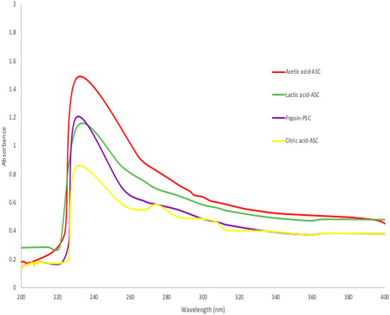 Generally, collagen and proteins have strong UV absorption due to their peptide connections and side chains. A 230 nm maximum absorbance of triple-helical collagen was due to glycine, proline and hydroxyproline [36]. According to Figure 1, maximum absorbance peaks were observed between 230 and 240 nm, when acetic acid, lactic acid, citric acid, and pepsin were used in the extraction of collagen from skin of bigeye fish. These values were comparable to those obtained from the skins of Horse Mackerels (Magalaspis cordyla) and Croaker (Otolithes ruber) [37], catla (Catla catla), rohu (Labeo rohita) [38], and scales and skin of tilapia (Oreochromis niloticus) [39]. Additionally, protein absorbs light most efficiently at a wavelength of 280 nm. Generally, the amino acid composition of collagen, such as tryptophan, tyrosine, phenylalanine, and other amino acids, was determined using a HPLC protocol or an amino acid analyser [16]. Additionally, amino acids such as histidine, tryptophane, phenylalanine, and tyrosine have absorption bands between 250 and 288 nm [22], whereas the collagen extracted from the skin of purple-spotted bigeyes had a smaller absorption wavelength. Furthermore, absorbance values between 200 and 220 nm were attributed to structural materials such as -COOR or -COOH [36].