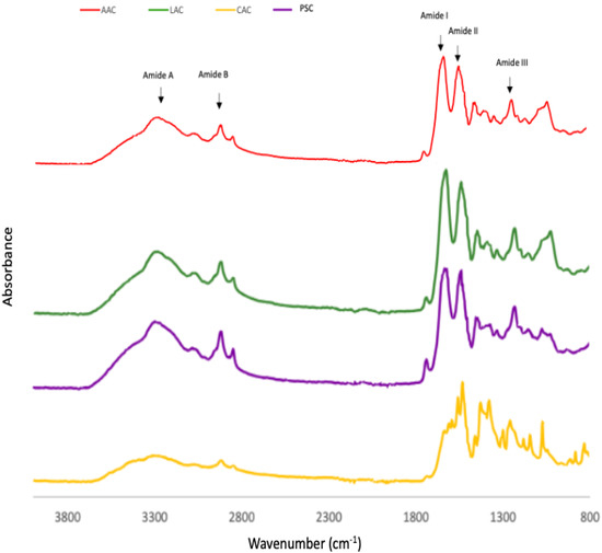 FTIR patterns of purple-spotted bigeye snapper skin collagen extracted with different acids and pepsin. AAC: Acetic acid collagen; LAC: Lactic acid collagen; CAC: Citric acid collagen; PSC: Pepsin soluble collagen.