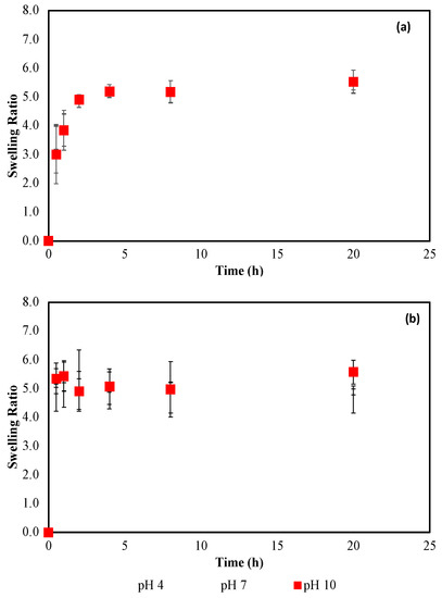 As illustrated in Figure 2, aqueous pH had little discernible effect on PNIPAAm equilibrium mass swelling ratio when examined in both buffered and titrated solutions at 20 °C (held in isothermal water bath). Additionally, the difference in swelling ratio for PNIPAAm in both aqueous systems is not statistically significant and generally average out to be Qeq,buff = 5.4 ± 0.3 over the three pH systems (Table 1). Similarly, titrated aqueous solutions had little effect on the swelling ratio of PNIPAAm at various pH (average Qeq,tit = 5.0 ± 0.3), with the only slight difference occurring between the pH = 4 and 10 systems (Figure 2b). This could be attributed to the effect of increased hydrogen ion interaction with the isopropyl and amino functional groups present in PNIPAAm, allowing for more hydrated polymer chains. It can be noted, however, when comparing swelling kinetics between gels placed in a buffered vs. titrated solution, equilibrium is achieved much more rapidly for the titrated solution gels (Figure 2) likely due to increased electrolyte presence in the buffered solutions that can interact with the polymer chains and slow the hydration process.