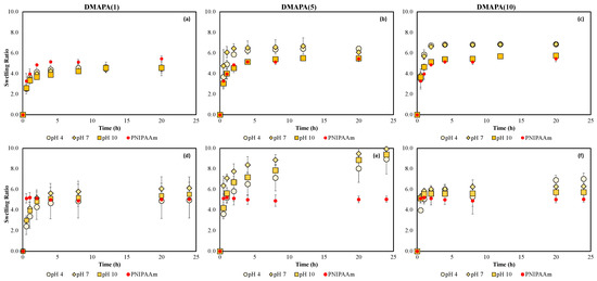 Kinetic swelling behavior of DMAPA hydrogels in the presence of varying pH aqueous solutions at 20 °C: buffered swelling behavior of (a) DMAPA(1), (b) DMAPA(5), (c) DMAPA(10), and titrated DI-H2O swelling behavior of (d) DMAPA(1), (e) DMAPA(5), (f) DMAPA(10). Red circles indicate PNIPAAm swelling averages; n = 3, error bars represent ± STD.