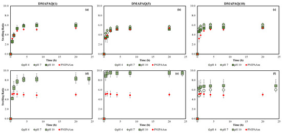 Kinetic swelling behavior of DMAPAQ hydrogels in the presence of varying pH aqueous solutions at 20 °C: buffered swelling behavior of (a) DMAPAQ(1), (b) DMAPAQ(5), (c) DMAPAQ(10), and titrated DI-H2O swelling behavior of (d) DMAPAQ(1), (e) DMAPAQ(5), (f) DMAPAQ(10). Red circles indicate PNIPAAm swelling averages; n = 3, error bars represent ± STD.
