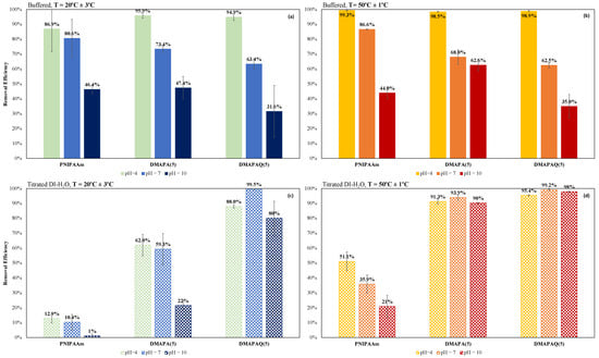 PFOA removal efficiency of PNIPAAm, DMAPA(5), and DMAPAQ(5) hydrogels at various aqueous pH values after 20 h: (a) buffered aqueous solution at T = 20 °C, (b) buffered aqueous solution at T = 50 °C, (c) titrated aqueous solution at T = 20 °C, and (d) titrated aqueous solution at T = 50 °C; n = 3, error bars represent ± STD.