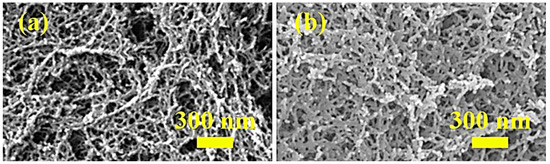 The microstructure of CAAs before and after hydrophobic modification is shown in Figure 1. Before hydrophobic modification, the CAAs had a three-dimensional nanoporous network structure, with a pore size of 50–100 nm. After hydrophobic modification, the P-CAAs maintained a good nanoporous network structure, indicating that PFDS does not destroy the nanoporous network structure of CAAs. As shown in Figure 1, the network structure of the modified aerogels became denser, which may result from the hydrophobic agents that promote network cross-linking in the gel.