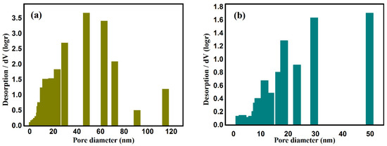 The pore size and distribution in the CAAs before and after modification by PFDS are shown in Figure 2. The pore size in CAAs prior to hydrophobic modification is mainly concentrated in the range 40–80 nm. The pore size in the P-CAAs was in the range 20–50 nm, in line with the SEM observations.