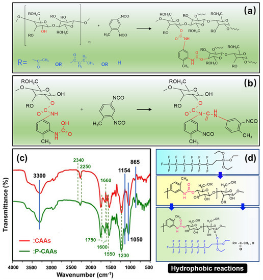 (a) First-form cross-linking reaction of cellulose acetate aerogel and (b) second-form cross-linking reaction of cellulose acetate aerogel. FTIR spectra of CAAs samples (c) (red) and P-CAAs (green) and (d) PFDS chemical modification reaction.