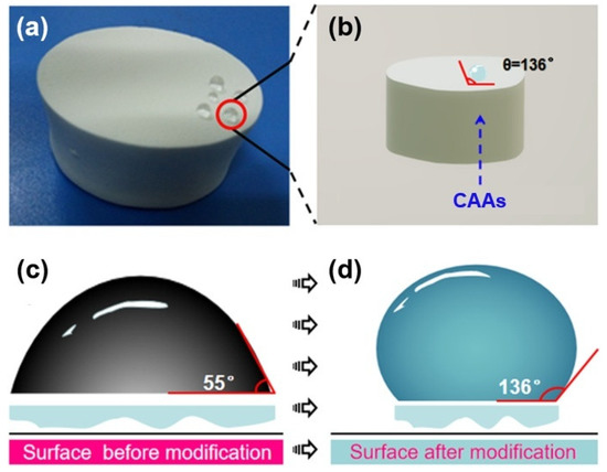 (a) A photograph of the hydrophobic CAAs and (b) a schematic of the hydrophobic surface. Schematic diagram of the water contact angle (c) before and (d) after hydrophobic modification.