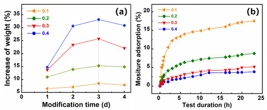 (a) Curves showing the influence of modification time on increase in weight at different hydrophobic agent/aerogel mass ratios, and (b) curves indicating the influence of moisture and test duration on different hydrophobic agent/aerogel mass ratios.