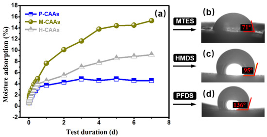 (a) Water contact angles and moisture absorption rates for different hydrophobic agents as a function of the hydrophobic test time. (b) Water contact angle of H-CAAs. (c) Water contact angle of H-CAAs. (d) Water contact angle of P-CAAs.