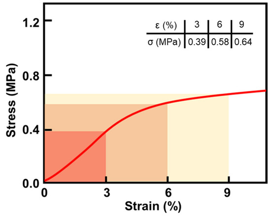 The compressive strength and modulus of cellulose acetate aerogels were tested by a WDW-100 electromechanical universal testing machine. For aerogel materials, the compressive strength is often expressed by the stress values corresponding to 10% and 25% strain. For testing, a preprocessed sample with a specific size (20 × 20 × 20 mm3) (five samples per group) was placed at the center of the pressure plate of the testing machine and pressurized vertically at a loading rate of 1 mm/min. The final compression data are shown in Figure 9. From the Figure 9, we can see that the stress of CAAs reached 0.39 MPa under 3% strain.
