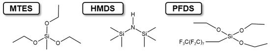 Traditional hydrophobic agents consist mostly of long-chain alkanes or long-chain silanes, both of which have longer carbon chains and contain groups, such as methyl and ethyl groups, which confer good hydrophobic properties [28]. The hydrophobic properties of different groups are ranked from high to low [29], as follows: -CF3, -CF2-, -CH3, and -CH2-. Perfluorodecyltriethoxysilane (PFDS), a fluorine-containing, long carbon chain silane with a variety of hydrophobic groups, including -CF3, -CF2-, -CH3, and -CH2-, exhibits better hydrophobic modification ability.