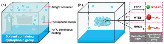 (a) Schematic diagram of the initial stage and (b) final stage of hydrophobic modification.