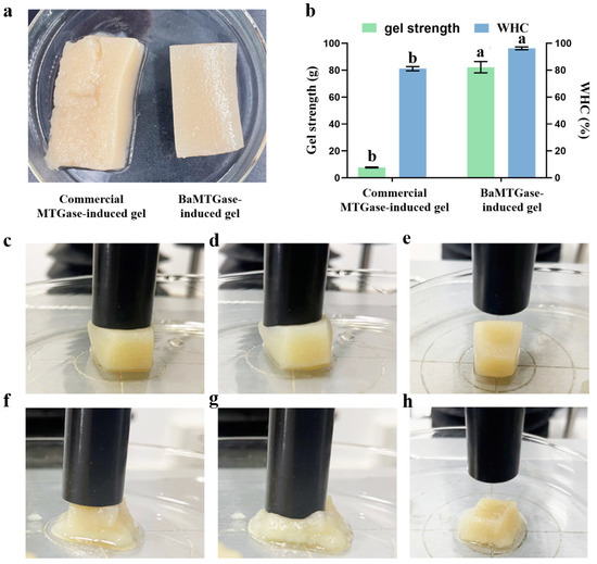 Gel strength and WHC of SPI gels. (a) Visual comparison of gels induced by commercial MTGase and recombinant BaMTGase. (b) Gel strength and WHC of SPI gels crosslinked by commercial MTGase and BaMTGase. (c) Morphological changes of the gel induced by BaMTGase when the texture analyzer touched the surface. (d) Morphological changes of BaMTGase-induced gel when the instrument squeezed gels. (e) Morphological changes of BaMTGase-induced gel after squeezing. (f) Morphological changes of commercial MTGase-induced gel when the texture analyzer touched the surface. (g) Morphological changes of commercial MTGase-induced gel when the instrument squeezed the gel. (h) Morphological changes of commercial MTGase-induced gel after squeezing. Letters above the bars in (b) indicate significant differences (p < 0.05).