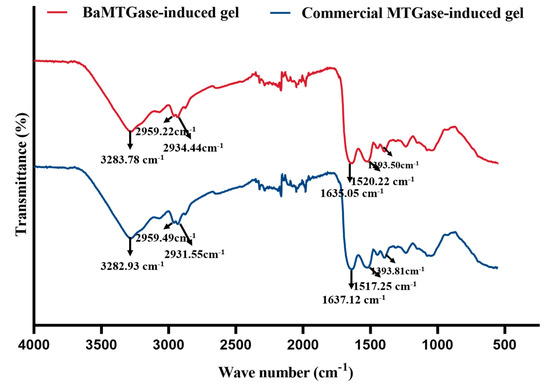 The secondary structure of the protein could be investigated with the help of the FTIR spectrum. As shown in Figure 5, the amide I region in the 1600–1700 cm−1 range is often used to analyze the secondary structure of proteins. The scope of each secondary structure attribution (1650–1660 cm−1, α-helix; 1618–1640 cm−1 and 1670–1690 cm−1, β-sheets; 1660–1670 cm−1 and 1690–1700 cm−1, β-turns; 1645 cm−1, random coils) referred to Wang et al. [22]. The proportion of the corresponding secondary structures of MTGase-induced gels was calculated based on the area of the peaks. As the data summarized in Table 2, the β-sheet structure and β-turns of the BaMTGase-induced SPI gel increased and the α-helix structure decreased.